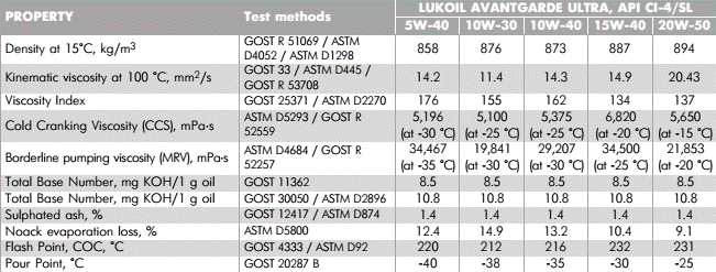LUKOIL AVANTGARDE ULTRA, API CI-4/SL is produced using modern synthetic and highly refined mineral base stocks with involvement of thoroughly balanced high-performance additive package of foreign manufacture.